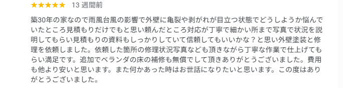 特に外壁塗装のような専門性の高い工事では、実際に施工を経験した方の声がとても参考になります。